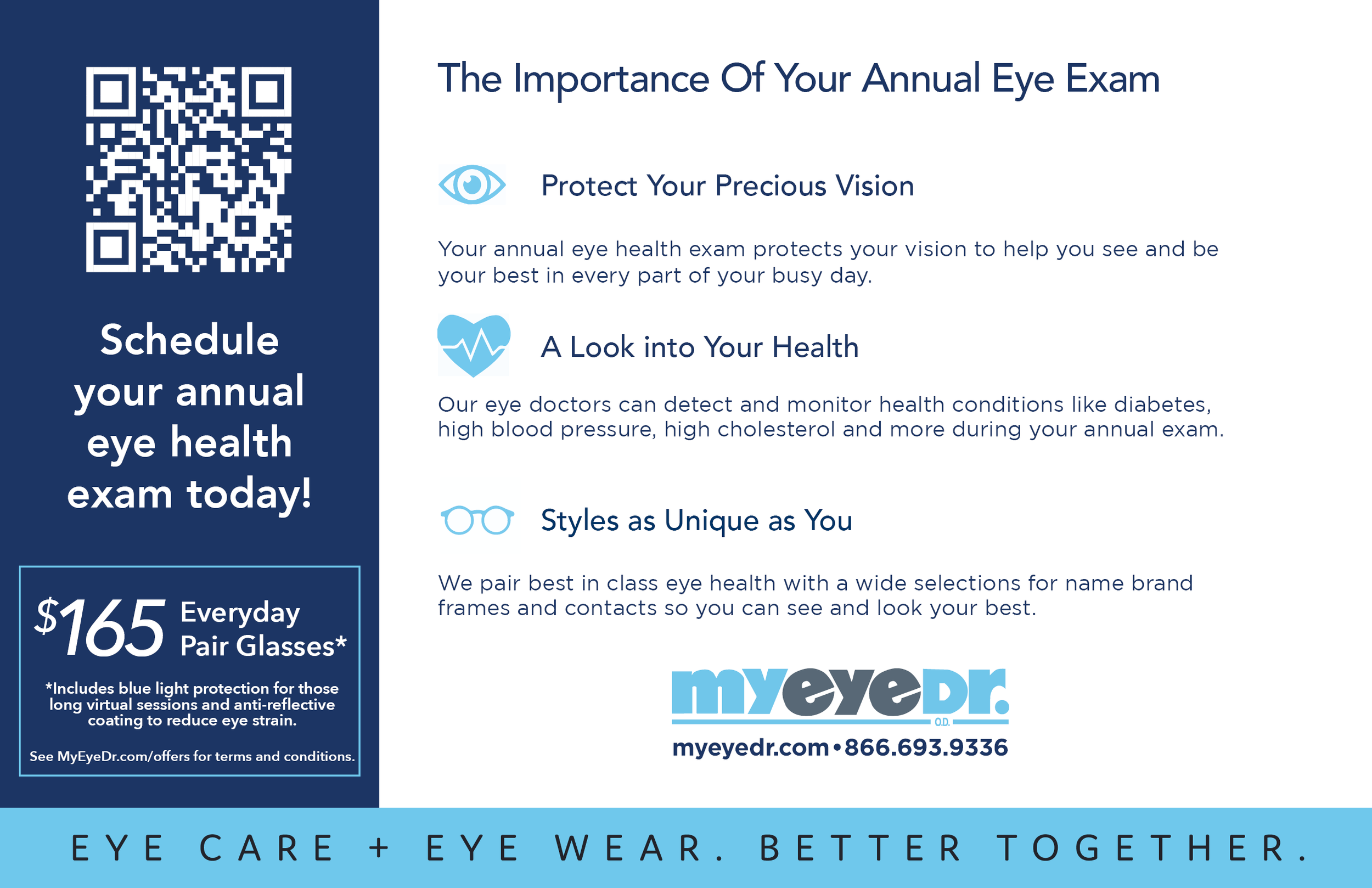 MyEyeDr. Postcard created with an evergreen promotional coupon to be mailed to clients local to a practitioner joining MyEyeDr.